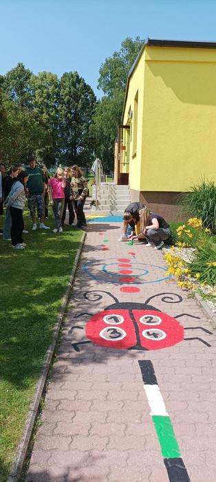 Ve čtvrtek 12. června se naši deváťáci v rámci výtvarné výchovy vydali do mateřské školy, aby pomohli s obnovou veselých obrázků na školkovém chodníku. Dopoledne využili k malování trvanlivými barvami, zatímco děti ze školky byly na výletě – a tak měli klid na práci.